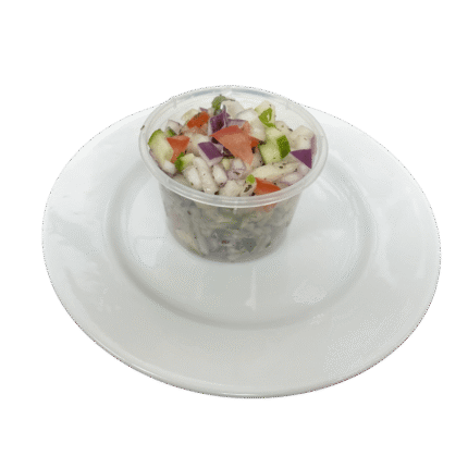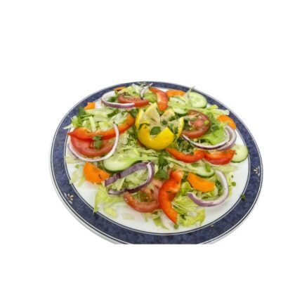 Barbecued with green peppers, tomato and onions, served with salad