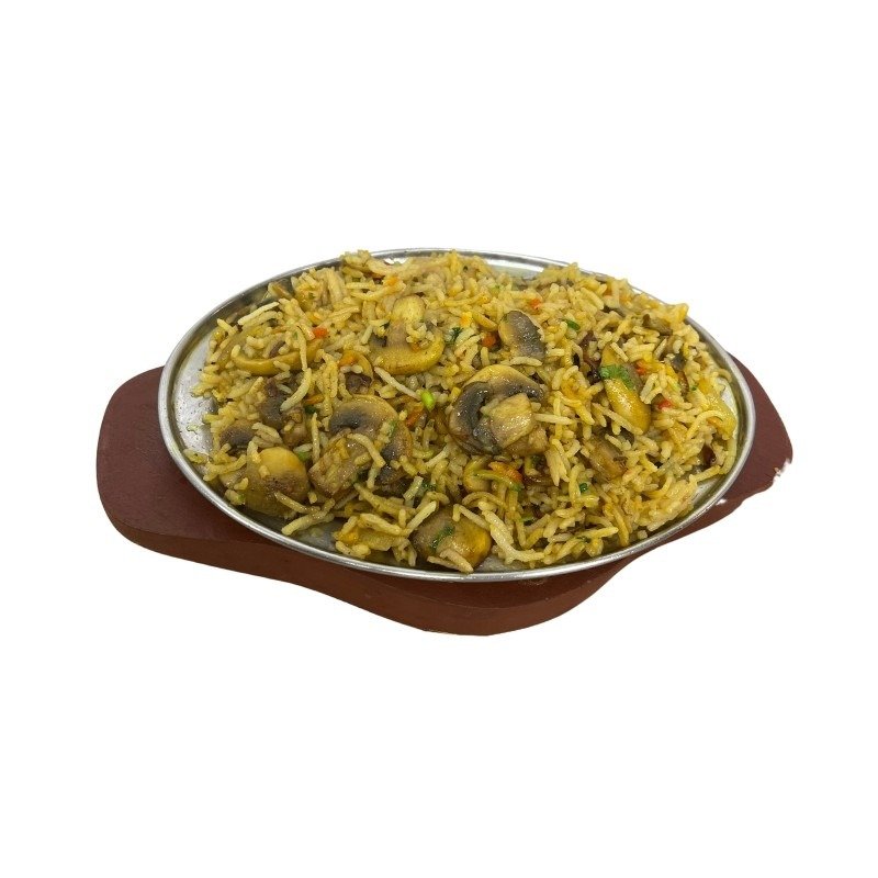 Ingredients: Mushrooms Cooked With Basmati Rice, Vegetable Ghee, Vegetable Oil Onion, Salt, Water, Bay Leaf, Cardamom, Bell Pepper, Chilli, Cinnamon Stick, Clove, Anise Seed, Turmeric, Fresh Coriander, Food Colours (Salt Based).